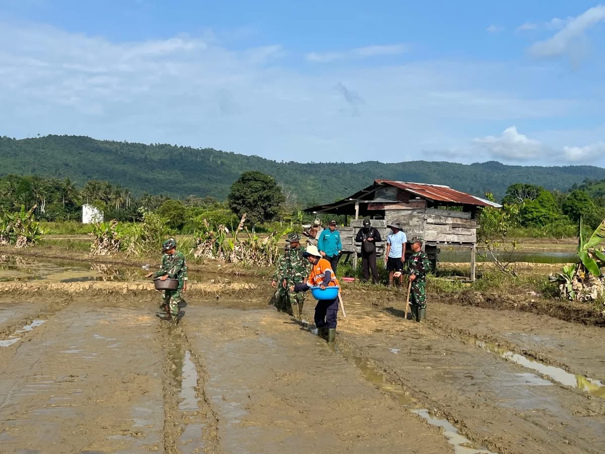 Pemdes Sekerat Bersama Kelompok Tani dan TNI Brigif 879/RC Tebar Benih Padi Dukung Ketahanan Pangan
